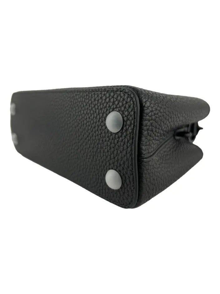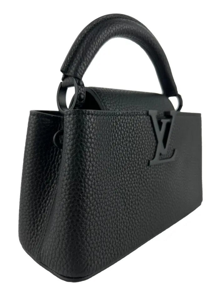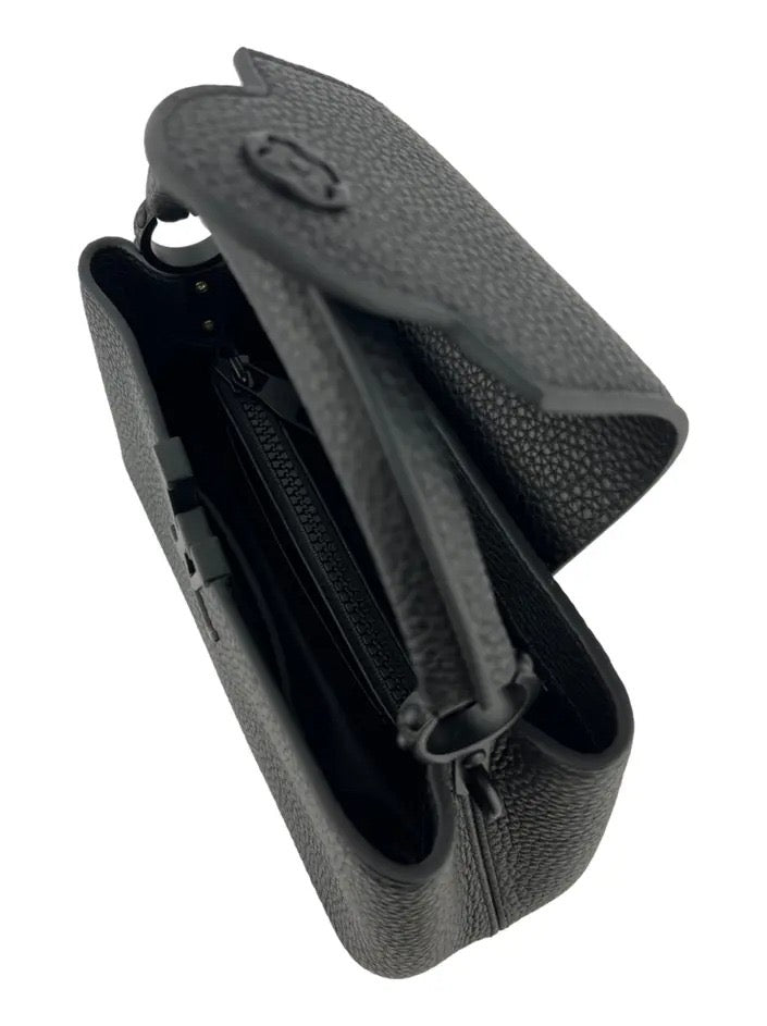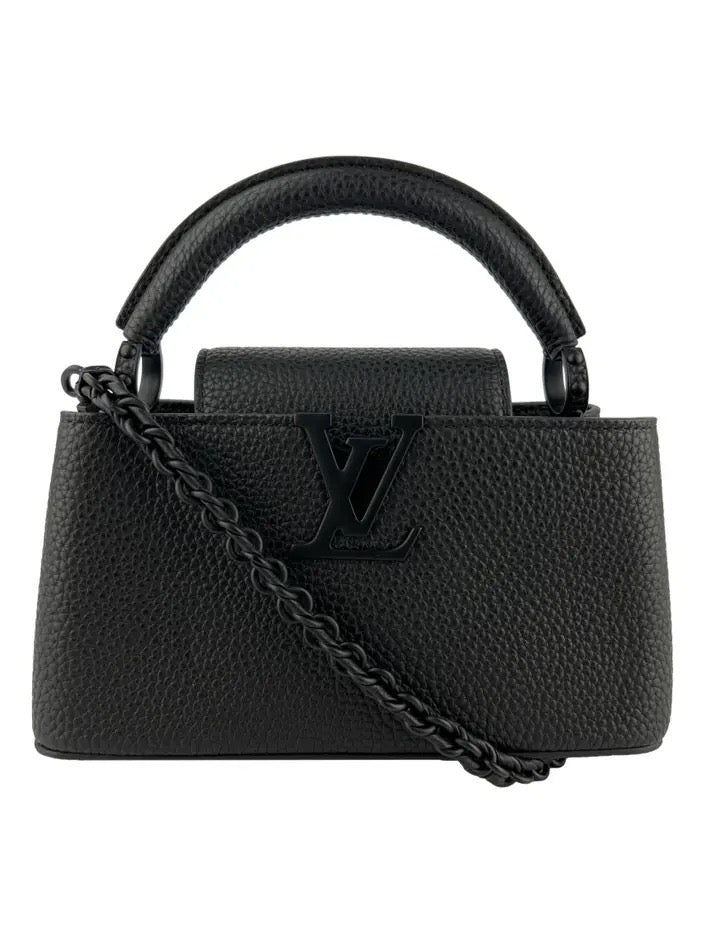 A Louis Vuitton Capucines East West Mini em couro preto é uma expressão de sofisticação discreta e design refinado. Seu formato horizontal proporciona um visual moderno, enquanto o acabamento monocromático — com logo LV e corrente na mesma tonalidade do couro — confere elegância atemporal. A alça superior estruturada e a alça longa com corrente permitem diferentes formas de uso. Compacta, porém impactante, essa bolsa é ideal para quem valoriza peças versáteis com presença marcante