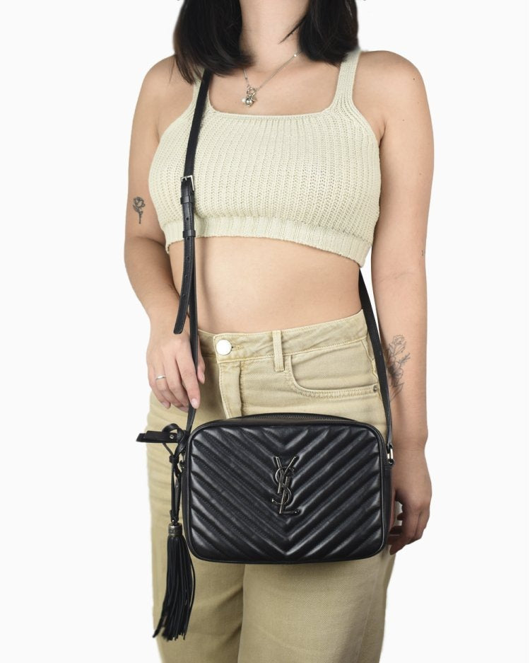 A Saint Laurent Lou Camera Bag é uma das peças mais icônicas da maison francesa, combinando funcionalidade, elegância e estilo atemporal. Confeccionada em couro matelassê com padrão chevron, este modelo na clássica versão preta é enriquecido pelo monograma metálico YSL na parte frontal, símbolo de sofisticação e tradição.